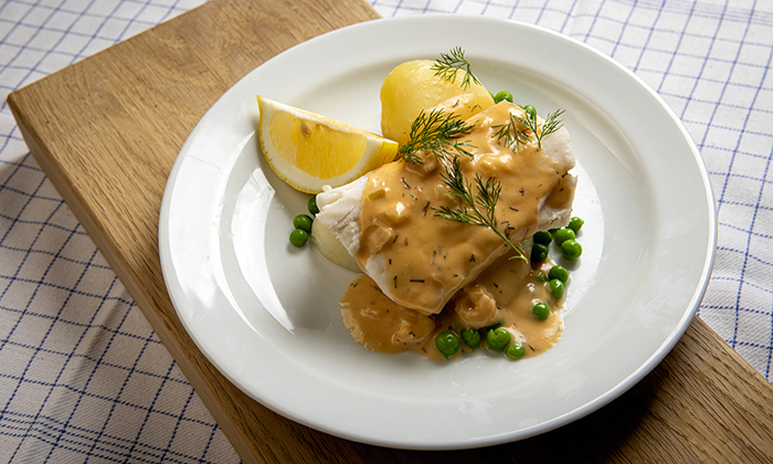 Potatis som är gul, gröna ärtor och en sås som har en fin färg - då smakar maten lite bättre. Foto: Håkan Risberg / Region Örebro län.